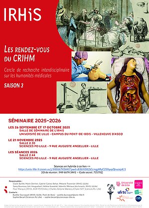 Dans le cadre du projet ELIM (Espaces et limites de l'innovation médicale), le Cercle de Recherches Interdisciplinaires en Humanités Médicales propose un séminaire mensuel sur une thématique transversale, afin de mettre en lumière des travaux récents de chercheuses et chercheurs français et étrangers dans une perspective historique. Le séminaire se tient sur le campus Pont de Bois ou à Sciences Po Lille.